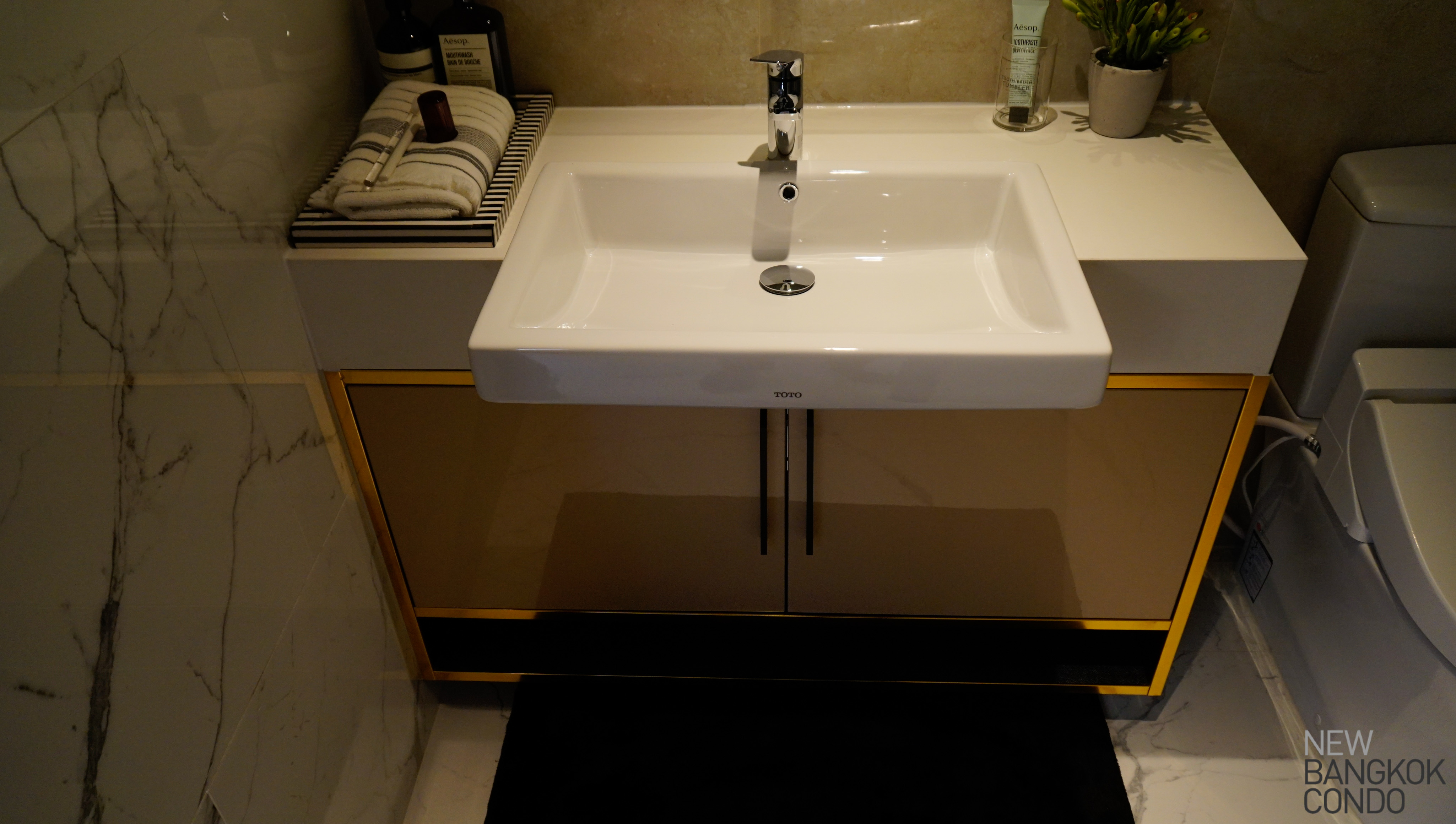 ห้องน้ำภายในห้องนี้สามารถเข้าได้จากห้องนั่งเล่นและห้องนอน เรามาดู Spec ภายในห้องน้ำกันดีกว่า CLOUD Residences – SKV23 เป็นอีกหนึ่งโครงการที่ใช้ Brand ค่อนข้างหลากหลาย โดยก๊อกและ Rain Shower จะเป็นของ Kohler สำหรับอ่างล้างหน้าและ Washlet จะได้เป็นของ TOTO โครงการนี้ได้ Washlet ด้วยน๊าาาาา แถมรุ่นที่ได้แบบเป็น Remote ด้วยนะ มาพูดส่วนที่ชอบก่อนดีกว่า สำหรับ Spec ในภาพรวม รุ่น และ Brand ที่ได้อยู่ในระดับกลางค่อนบนนิดๆ ถ้าเทียบกับโครงการใน Segment Luxury-Super Luxury ของโครงการอื่นๆ ซึ่งถือว่าผ่านนะ ในโซนเปียกมีชั้นวางของถือว่าผ่านอีกเช่นกัน สำหรับ Floor drain โครงการนี้ถึงจะเป็นสำเร็จรูปแต่หน้าตาสวยใช้ได้ ดังนั้นไม่ติดครับ สำหรับส่วนที่ไม่ค่อย In เท่าไหร่ เต้เชื่อว่าหลายๆ คนน่าจะเดาได้ เพราะสิ่งนั้นคืองานกระเบื้องครับ กระเบื้องลายหินไม่ผ่านครับ การ Mix กระเบื้องไม่ผ่านอีกเช่นกัน อย่างไรก็ตามมันเป็น Personal taste นะครับ ผมเชื่อว่าหลายๆ คนอาจจะชอบก็เป็นได้ และท้ายสุดที่เต้ค่อนข้างกระแทกตาเต้มาก สิ่งนั้นก็คือเฟรมสีทองที่ตู้ใต้อ่างที่เป็นสีทอง เต้ว่ามันท้องทองไปนิดนึง เต้ Feedback ขอเปลี่ยนสีไปแล้วครับ ไม่รู้ว่าเปลี่ยนไหมน๊า